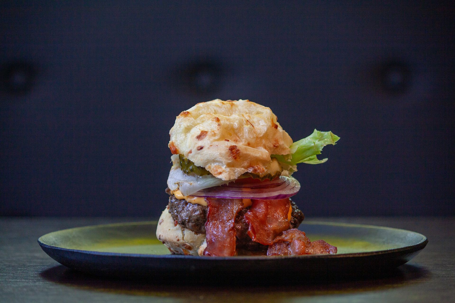 Pão de queijo do ponto rock, burger blend 25 gr, american cheese, aioli de páprica defumada, bacon’ onion jam, alface americana, tomates italianos, cebolas roxas e pickles de pepinos