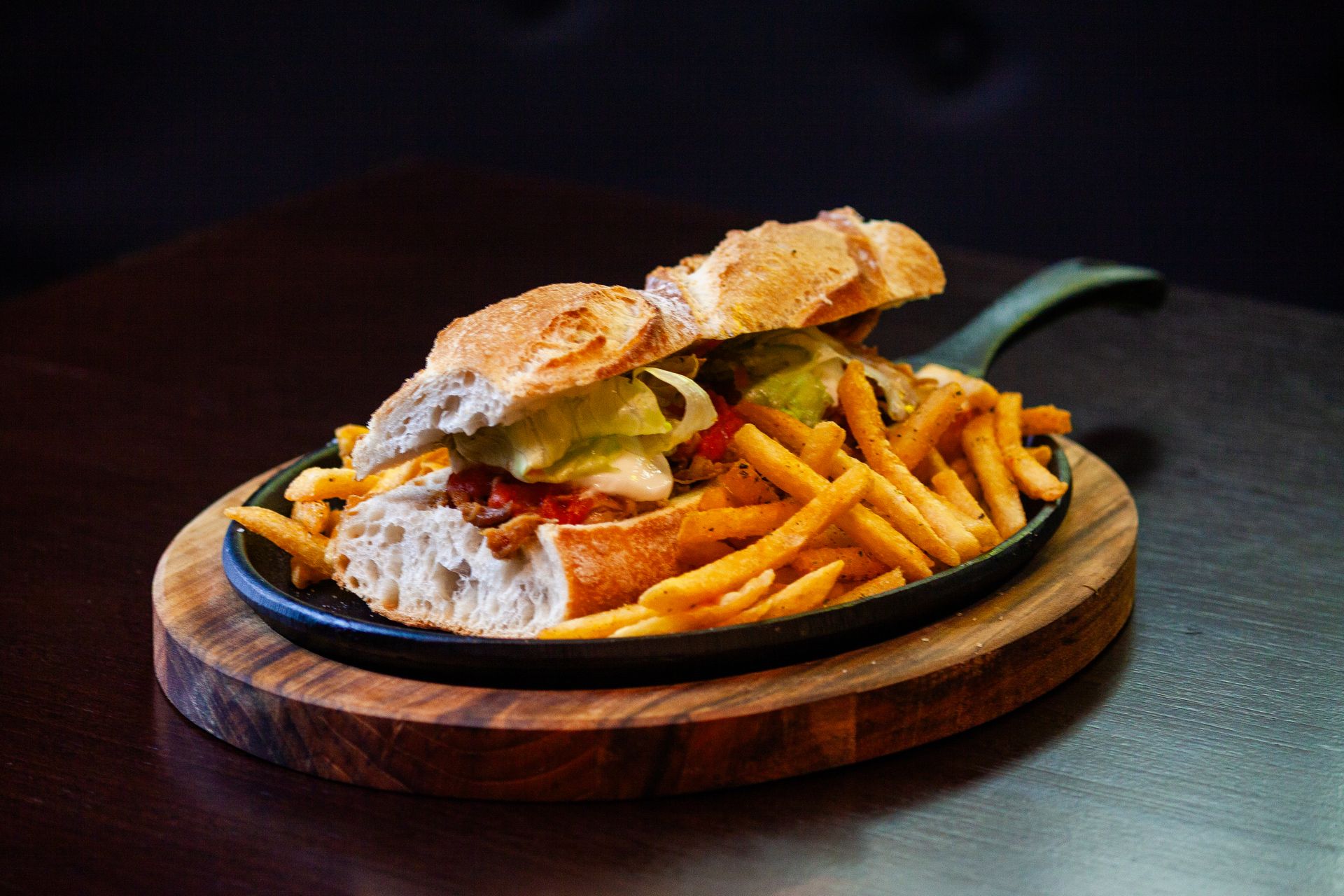 Pão baguete artesanal, pernil do ponto rock, alface americana, purê de tomates, molho do pernil, gremolata e muçarela tostada, acompanhado de Classic Fries