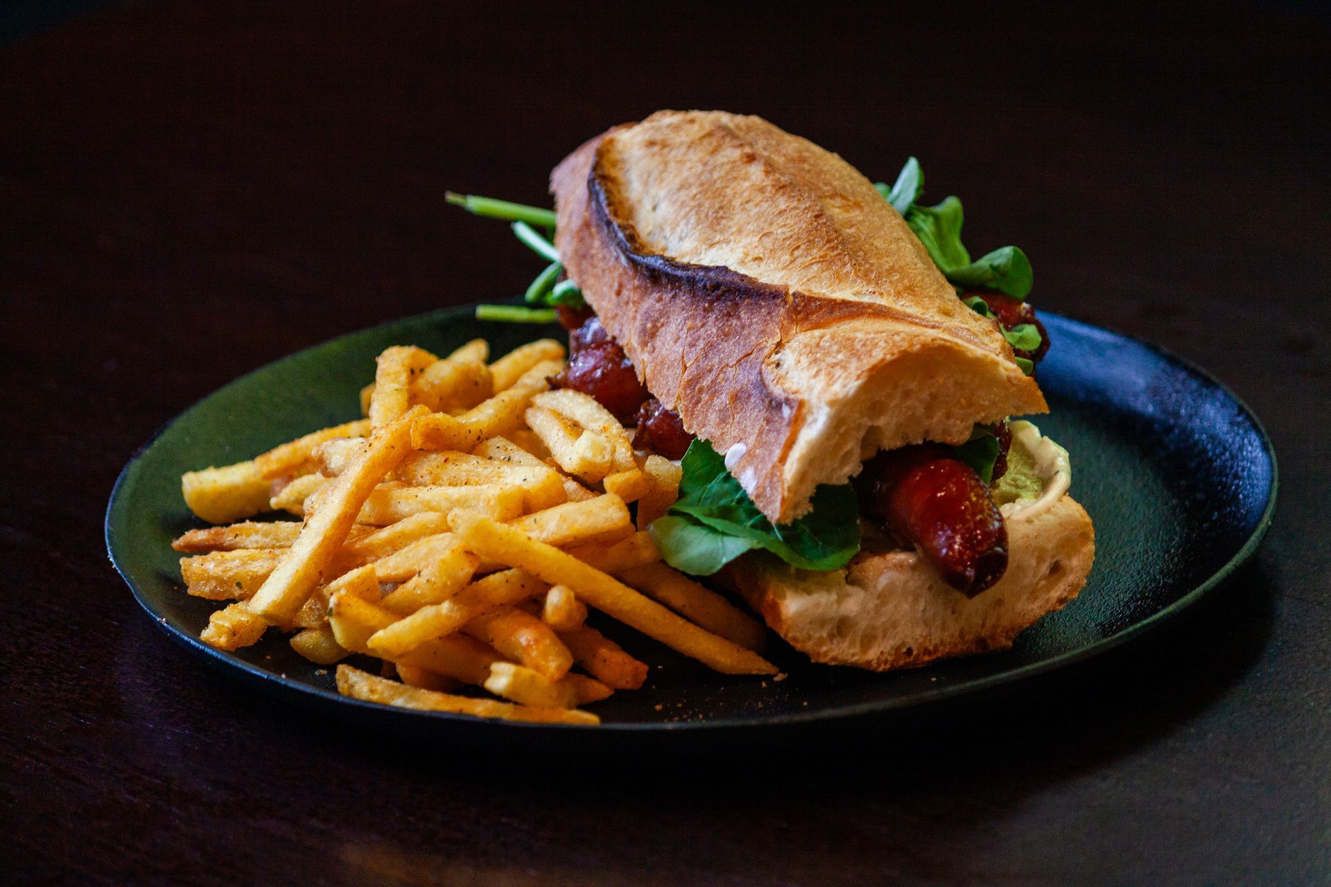 Pão baguete artesanal, linguiça caseira, molho do pernil, sour cream, mostarda dijon, muçarela tostada e rúculas frescas, acompanhado de Classic Fries