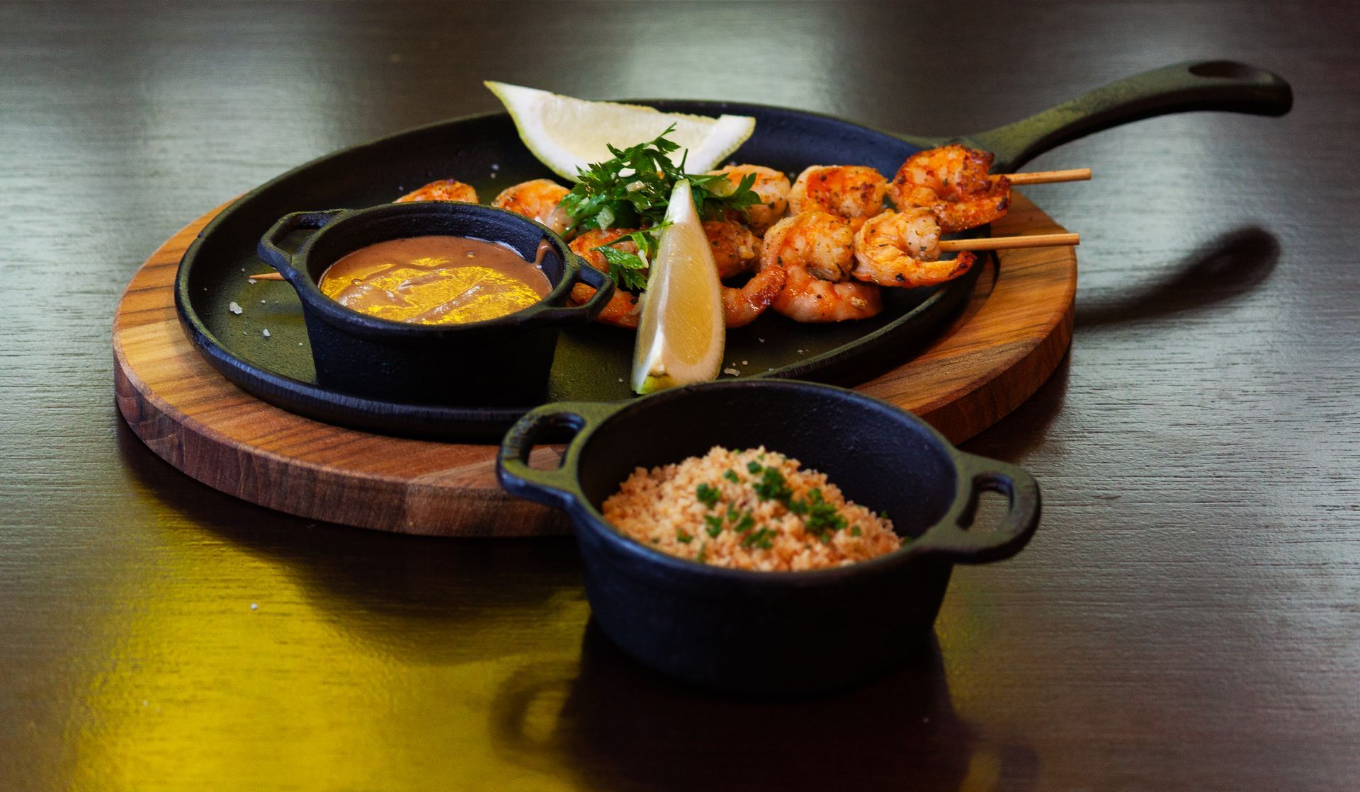 Espetinhos de camarões rosa, grelhados em manteiga e glaceados com BBQ rock sauce, acompanhados de farofinha crocante e limões a francesa