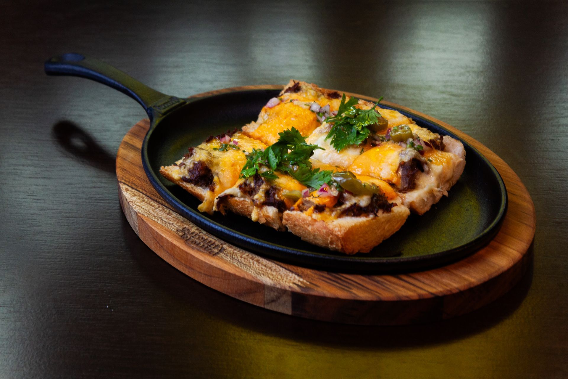 Sanduíche aberto de baguete artesanal, servido em tiras, coberto por chili com carne cozidos lentamente, american cheese, muçarela tostada e cebolinhas frescas