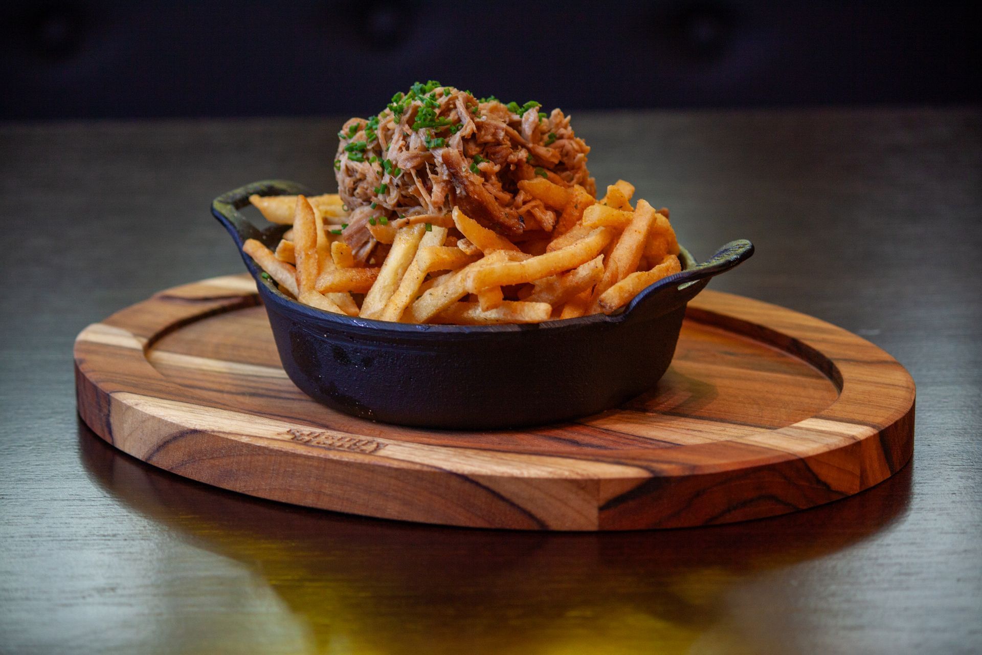 Batatas fritas sequinhas e crocantes, temperadas com rub para batatas do ponto rock, cobertas pelo pernil do ponto rock desfiado, molho do pernil e cebolinhas frescas