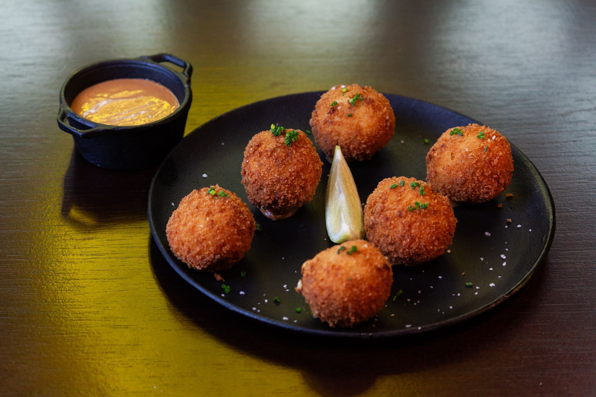 Croquetas cremosas por dentro e crocantes por fora, feitas com o exclusivo pernil do ponto rock, acompanhadas por spicy rock sauce e limões à francesa