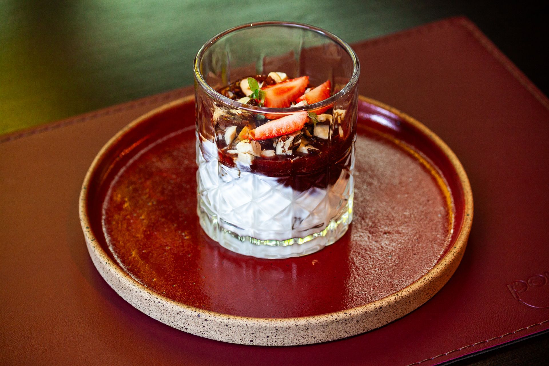 Taça de morangos assados com calda de balsâmico, creme de iogurte natural e crumble de avelãs