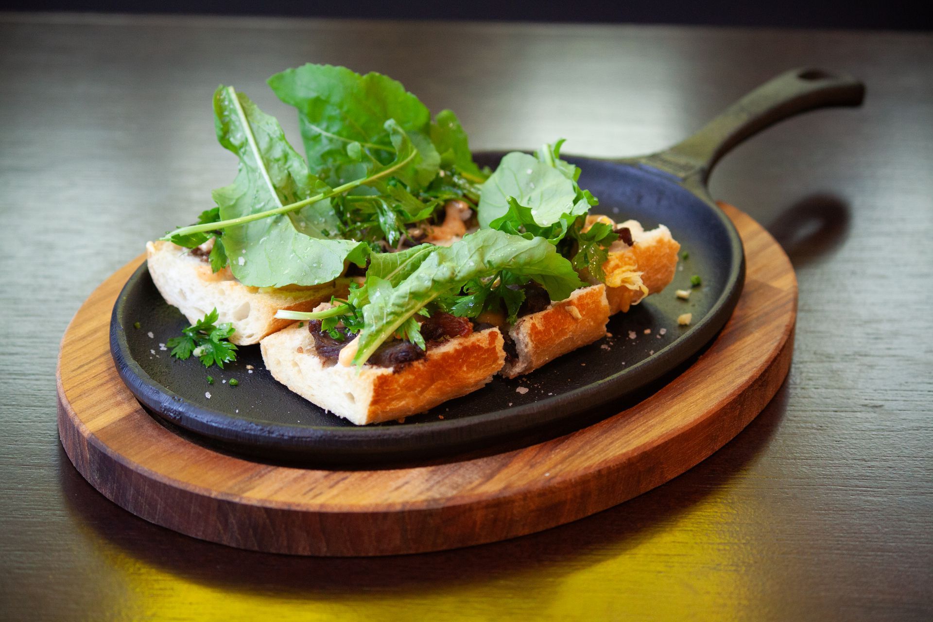 Sanduíche aberto de baguete artesanal, servido em tiras, coberto por roast beef de chorizo de angus maturado, aioli de páprica defumada, gremolata e rúculas frescas