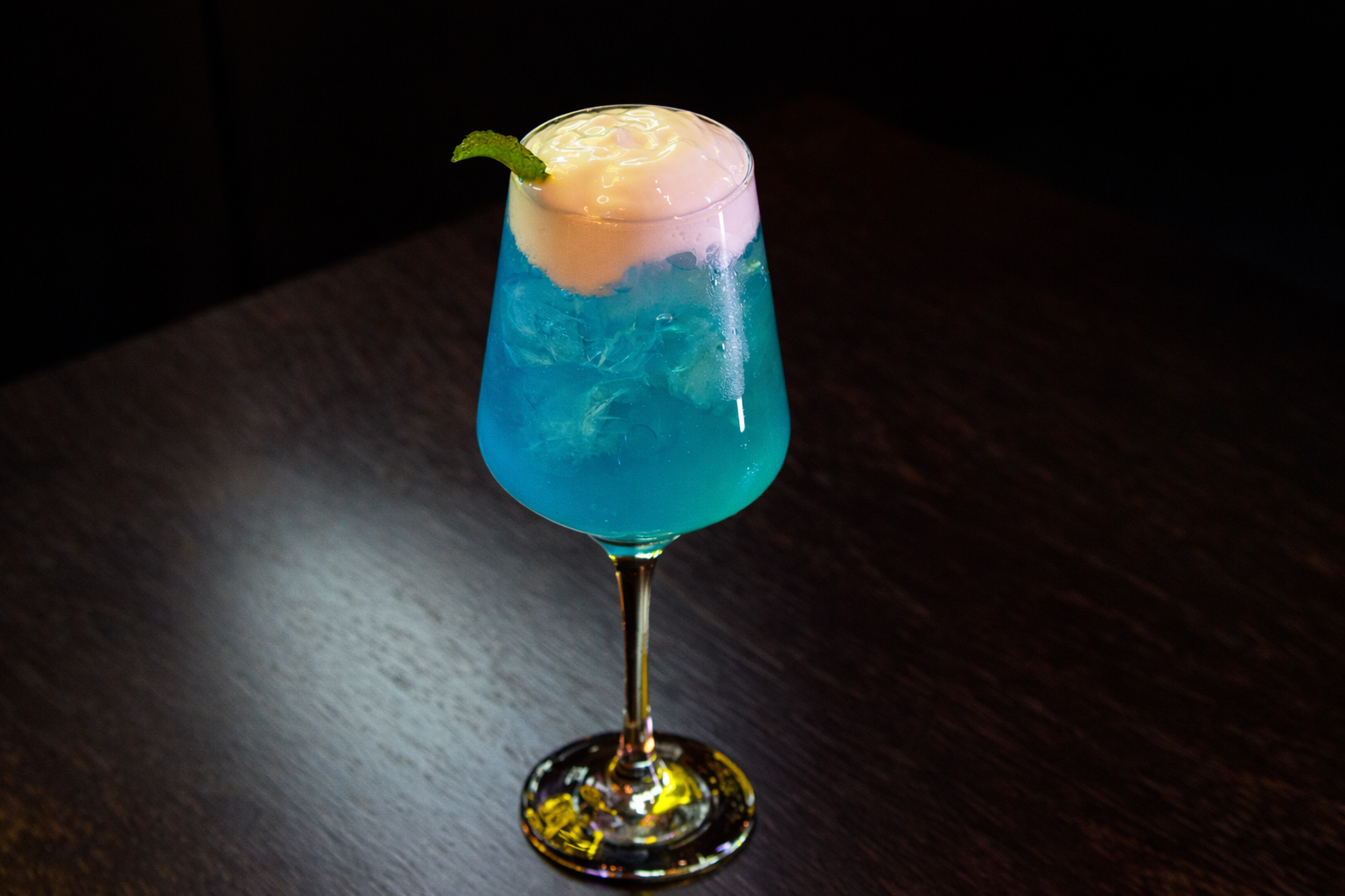 Vodka, Curaçau blue, limão siciliano, agua com gás e espuma de côco