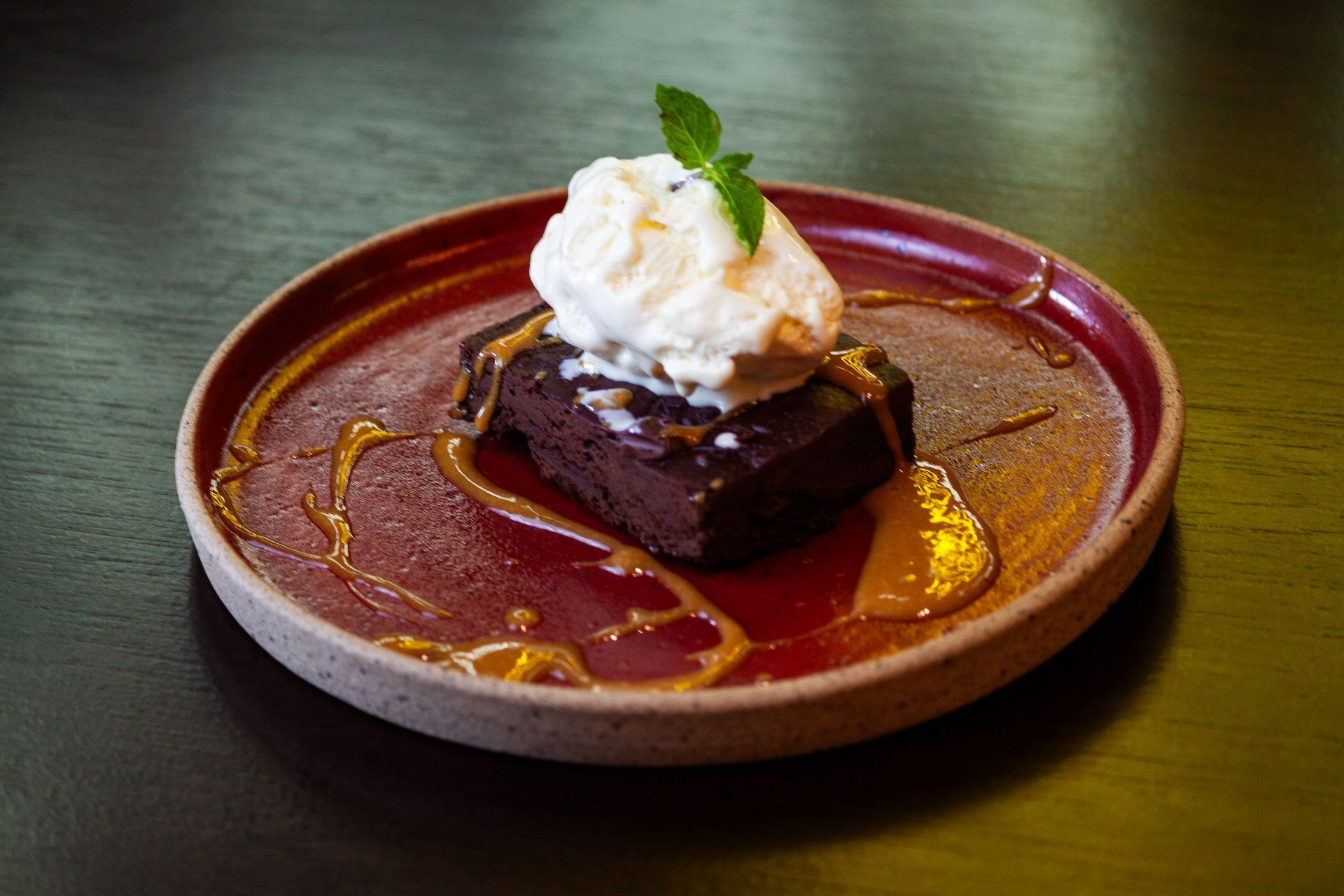 Brownie e Cookie assados juntos, servidos com calda de whiskey e sorvete artesanal de baunilha
