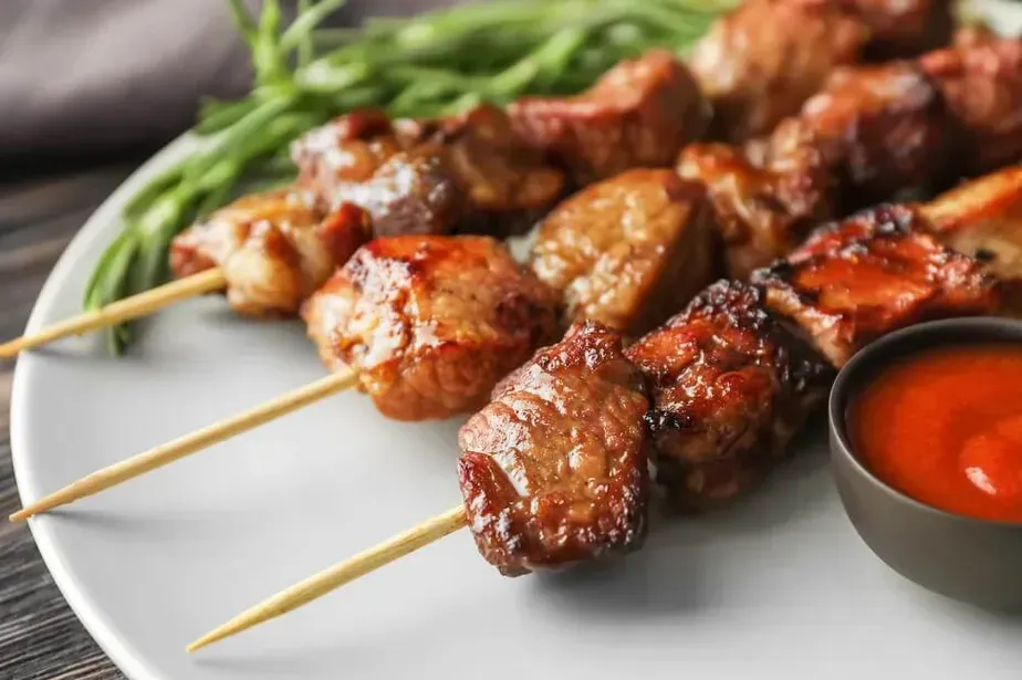 Chorizo de angus certificado no espetinho, grelhado em manteiga, acompanhado de spicy rock sauce e farofinha crocante
