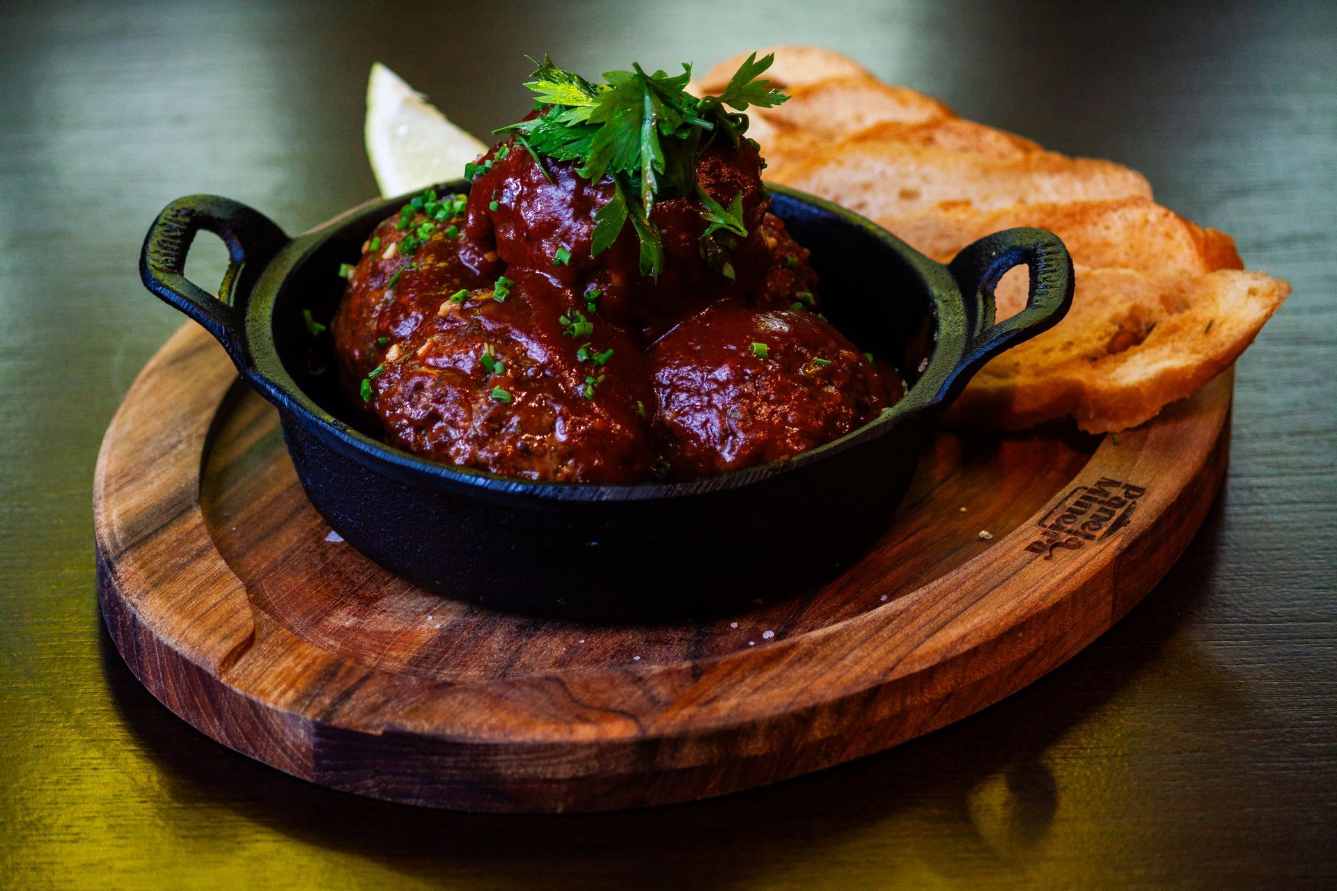 Almôndegas caseiras, BBQ Rock Sauce, gremolata, cebolinhas frescas e limões à francesa, acompanhadas de fatias tostadas de baguete artesanal