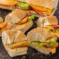Sanduíche aberto de baguete artesanal, servido em tiras, coberto por purê de tomates, pesto, pasta de azeitonas pretas, tomates italianos frescos e muçarela tostada